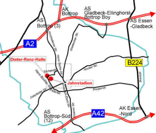 Wegbeschreibung von der Autobahn A 2 Abfahrt Bottrop (3) Richtung Stadtmitte (Kirchhellener Straße; im weiteren Verlauf Hans-Sachs-Straße). An der Kreuzung Hans-Sachs-Straße/Eichenstraße rechts in die Eichenstraße abbiegen. Ab der Kreuzung sind die Dieter-Renz-Halle und das Jahnstadion ausgeschildert.