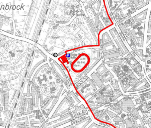 Wegbeschreibung von der Autobahn A 42 Abfahrt Bottrop-Süd (12) Richtung Stadtmitte (Essener Straße; im weiteren Verlauf Freiherr-vom-Stein-Straße, Friedrich-Ebert- Straße). Von der Friedrich-Ebert-Straße links in die Prosperstraße (im weiteren Verlauf Peterstraße und Hans-Böckler-Straße) Richtung Zentrum abbiegen. Ab der Kreuzung Peterstraße/ Osterfelder Straße sind die Dieter-Renz-Halle und das Jahnstadion ausgeschildert.