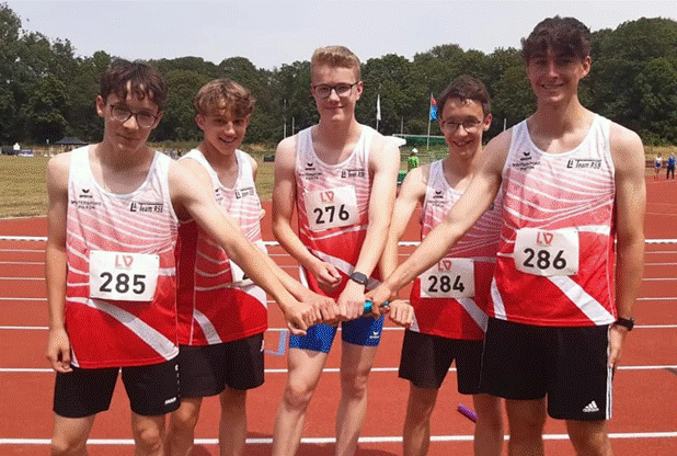 In einer Zeit von 45,75 Sekunden setzte sich das Team mit Jonah Stricker (Bottrop), Constantin Behne (Bottrop), Justus Behne (Bottrop) und Niklas Venhues (Rhede) sowie Ersatzläufer Niklas Meller (Bottrop) an die Spitze vor der Startgemeinschaft Essen-Ruhr und dem TV Ratingen.